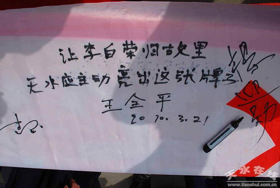 經(jīng)過幾天的籌備,2010年3月21日,天水在線發(fā)起了一場“李白故里在天水”的正名活動。2010年3月25日,雷達(dá)先生發(fā)表文章,對天水在線發(fā)起的正名活動給予了高度評價,雷達(dá)先生在文中寫道:我在博客貼出《李白故里在甘肅秦安》一文并經(jīng)天水在線轉(zhuǎn)發(fā)后,甘肅天水當(dāng)?shù)兀ㄇ匕矊儆谔焖┑姆磻?yīng)之強(qiáng)烈,特別是民間自發(fā)舉行了萬人簽名“正名活動”,是我始料不及的;遠(yuǎn)在北京的我,甚感驚奇。當(dāng)我看到歡欣的少男少女和市民們紛紛簽名時,我覺得他們像是在參加一次狂歡,或一次踏青和春游,氣氛是喜悅的。這充分顯示了他們對李白,對家鄉(xiāng),對民族文化傳統(tǒng)及其瑰寶的熱愛,在更深的層面上,是否還表現(xiàn)了他們急于改變甘肅經(jīng)濟(jì)文化落后面貌的渴望,實在令人感動。