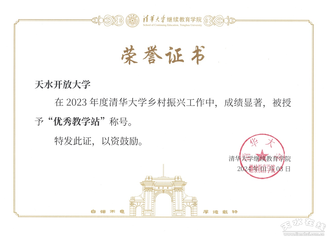 近日,2023年清華大學(xué)鄉(xiāng)村振興人才培訓(xùn)年終總結(jié)會(huì)在江蘇蘇州舉行,線上與線下同步進(jìn)行。會(huì)上表彰了2023年度工作成績顯著的優(yōu)秀教學(xué)站和先進(jìn)個(gè)人,學(xué)校榮獲“2023年度優(yōu)秀教學(xué)站”,這是天水開放大學(xué)連續(xù)四年獲此殊榮。