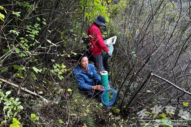 項(xiàng)目工區(qū)內(nèi)丘陵起伏、帶狀沖溝發(fā)育,地形較為復(fù)雜,地表植被覆蓋密度大,荊棘叢生,施工時(shí)需要人工砍樹開路,遇上險(xiǎn)要地形,工人常將儀器背在背上以便于技術(shù)人員進(jìn)行數(shù)據(jù)采集。施工期間正值秋季雨水較多,天氣漸涼,施工壓力較大,面對(duì)復(fù)雜的施工環(huán)境及嚴(yán)峻的天氣,普查隊(duì)技術(shù)人員充分發(fā)揚(yáng)“三光榮”“四特別”地質(zhì)精神,在確保安全的前提下,搶抓項(xiàng)目進(jìn)度,圓滿完成了此次瞬變電磁野外數(shù)據(jù)采集工作。
