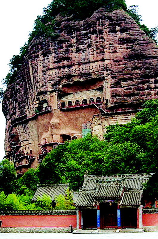 麥積山是在僧帽山、羅漢崖、豆積山、香積山、小獻(xiàn)山、夕照壁、蒼龍嶺和蟠桃峰等群山環(huán)抱中拔地而起的一座秀麗山峰。山崖上棧道勾連,洞窟如巢,在眾多的洞窟里塑有自北魏至唐宋時期諸朝塑像,因其藝術(shù)之精湛被譽(yù)為“東方雕塑陳列館”。整個山崖與盤繞半環(huán)形的蒼龍嶺相連,在半環(huán)型內(nèi)側(cè)自然形成一塊較為寬闊平坦的場地,為游覽者攝影、小憩和野餐提供了極大的方便。場內(nèi)整日游人如梭,喧若鬧市。場地背靠麥積崖下是麥積山寺,亦即瑞應(yīng)寺。場地之南原建有一座廟會時演唱地方戲的戲樓,場地中心有一水池,配置有亭榭回廊。池水中開滿蓮花,“有風(fēng)既作飄搖之態(tài),無風(fēng)亦呈裊娜之姿”,蓮葉搭蓬,花開水面,濯清漣而不嬌,疑是天宮瑤池,被譽(yù)為蓮花池。
