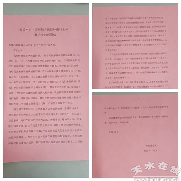 近日,天水市第二人民醫(yī)院腫瘤科收到了一封來(lái)自患者家屬的深情感謝信和一面寫有“醫(yī)德高尚暖人心,醫(yī)術(shù)精湛傳四方”錦旗,字里行間流露出對(duì)市二院腫瘤科醫(yī)護(hù)團(tuán)隊(duì)無(wú)微不至關(guān)懷與精湛醫(yī)術(shù)的深深敬意,這不僅是對(duì)腫瘤科全體醫(yī)護(hù)人員工作的認(rèn)可,更是對(duì)醫(yī)院整個(gè)醫(yī)療團(tuán)隊(duì)不懈努力與奉獻(xiàn)精神的最好證明。