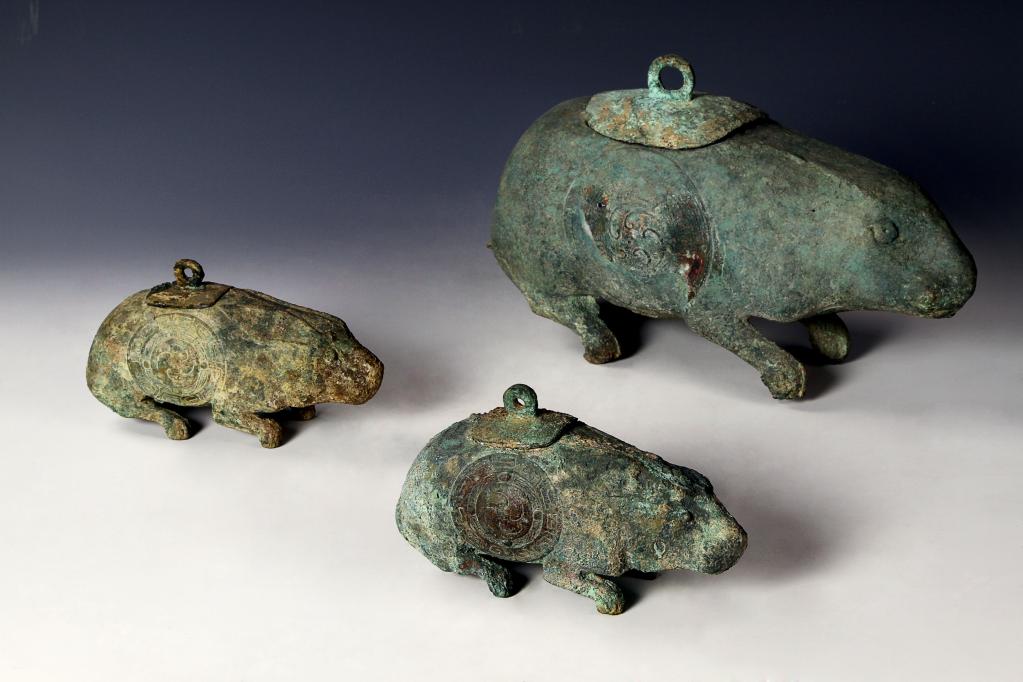 這是晉穆侯墓出土的3件背上開長方形口,口上有蓋的青銅兔尊。山西省晉國博物館供圖