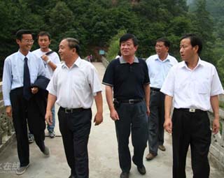 (八屆全國政協(xié)常委、原甘肅省委書記李子奇(右四)一行視察洛門鎮(zhèn)響河溝災(zāi)害治理概況)