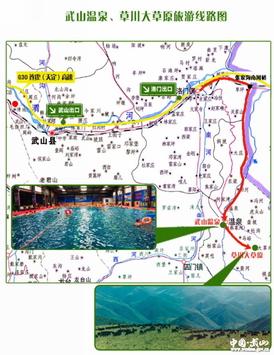 武山溫泉位于武山縣城東南25公里的溫泉鄉(xiāng)境內(nèi),是國內(nèi)外少有的復(fù)合型礦泉,現(xiàn)有蘭州鐵路療養(yǎng)院和甘肅省衛(wèi)生廳直屬療養(yǎng)院。療養(yǎng)區(qū)東南西三面群山環(huán)繞,安靜幽雅,空氣潔凈、無噪音污染,年溫差小,每逢春、夏、秋季,鳥語花香,氣候宜人,是療養(yǎng)康復(fù)的最佳期。