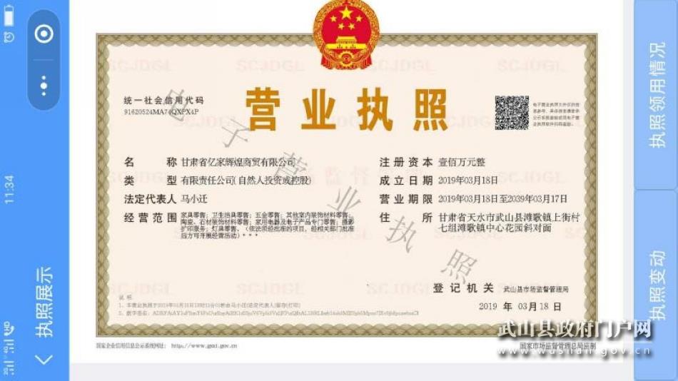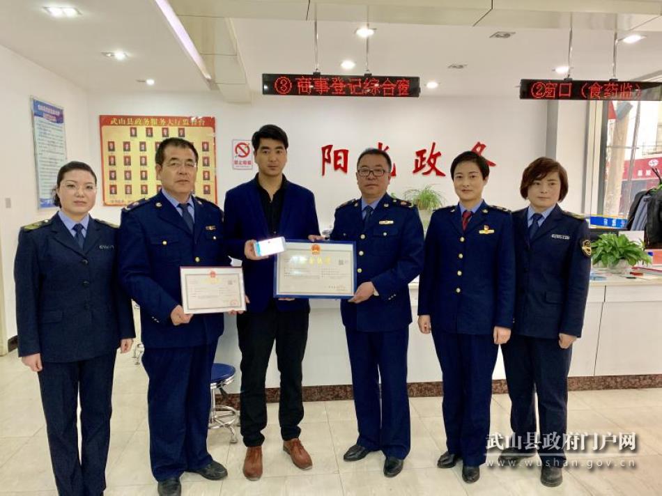 3月19日,武山縣市場監(jiān)督管理局在縣政務(wù)服務(wù)大廳市場監(jiān)管局服務(wù)窗口,為甘肅省億家輝煌商貿(mào)有限公司法定代表人馬小遷頒發(fā)了全縣首張電子營業(yè)執(zhí)照,標志著全程電子化企業(yè)登記注冊工作邁上新臺階。