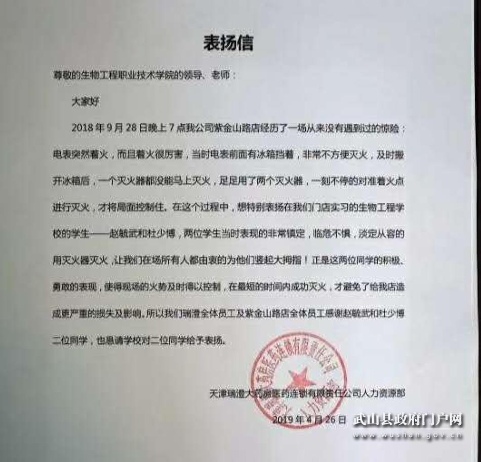 (圖為杜少博在天津救火之后該公司發(fā)布的表揚信)