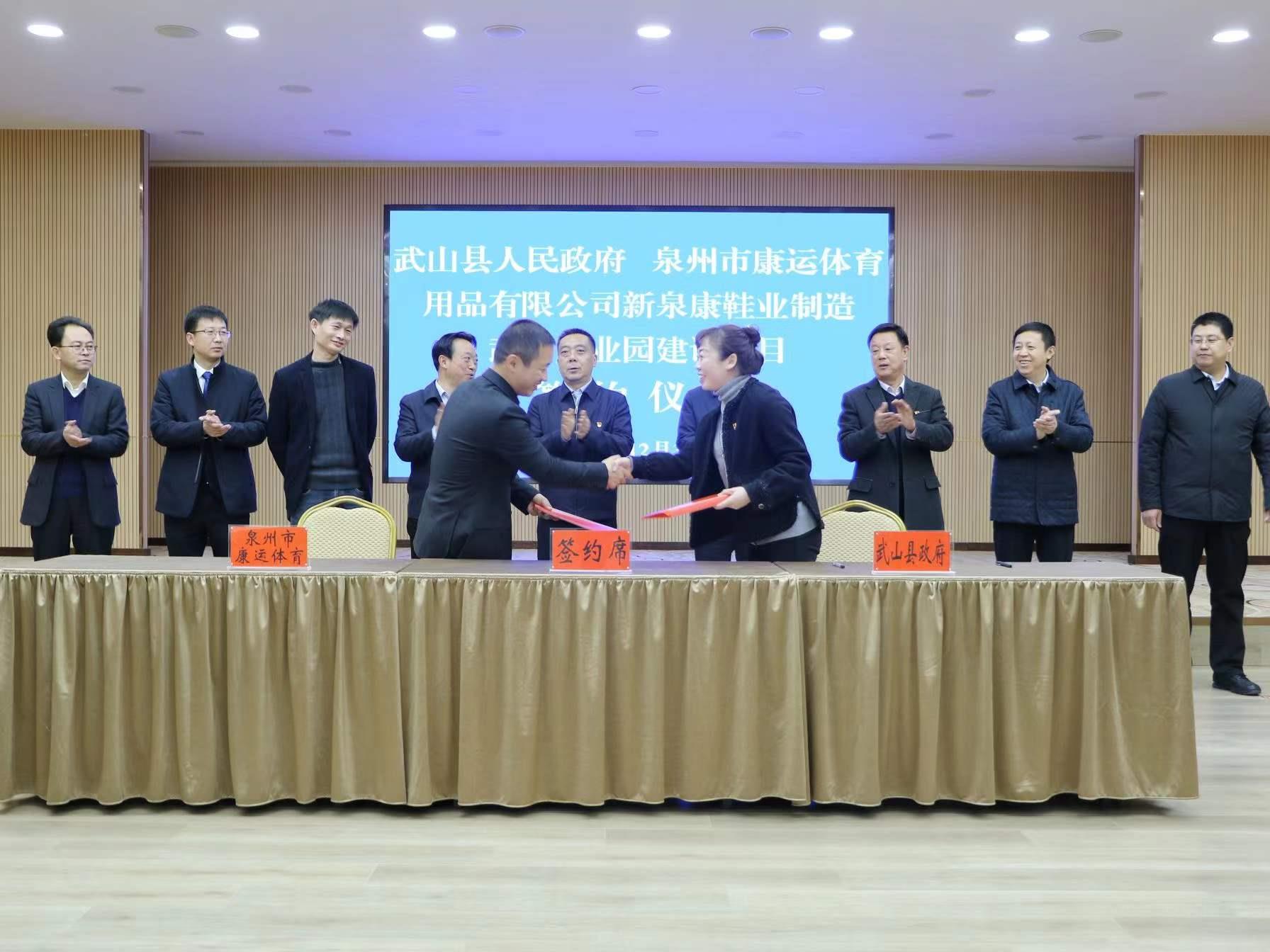 武山縣融媒體中心12月31日訊(記者 包玉霞 董世雄)12月31日,武山縣人民政府與泉州市康運(yùn)體育用品有限公司舉行新泉康鞋業(yè)制造武山產(chǎn)業(yè)園建設(shè)項(xiàng)目簽約儀式。縣委書記王新強(qiáng)出席儀式并致辭,縣委副書記、縣長王志成主持簽約儀式?h人大常委會主任孫德銀,縣政協(xié)主席龐明全,縣委副書記馬福勝,縣委常委、統(tǒng)戰(zhàn)部部長李森,縣委常委、副縣長趙百祥,副縣長劉莉娜,泉州市康運(yùn)體育用品有限公司董事長金順利、總經(jīng)理謝滿福、副總經(jīng)理?xiàng)钭诮艿葏⒓雍灱s儀式。