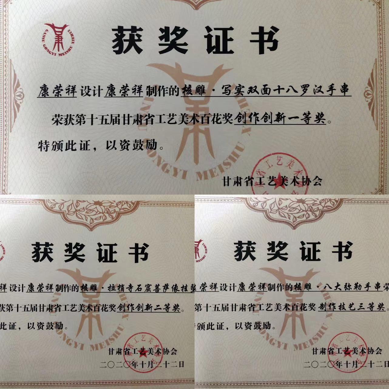 康榮祥在微型雕刻工藝中,十年磨一劍,成長為一名雕工精巧熟練、刀法干練細微的核雕藝人,F(xiàn)為中國工藝美術學會會員、甘肅省工藝美術協(xié)會會員、天水市民間藝術家協(xié)會理事、武山縣民間藝術家協(xié)會秘書長、武山縣玉雕協(xié)會理事、武山縣鄉(xiāng)村振興致富帶頭人。他一如既往的探索追求,不斷提高自己的審美情趣,不斷的超越自我,作品多次參展 “天水旅游作品展”“中國天水伏羲文化旅游節(jié)” “蘭州國際收藏博覽會”“敦煌文化藝術節(jié)”,榮獲第十五屆甘肅省工藝美術百花獎創(chuàng)作創(chuàng)新“一等獎”“二等獎”和制作技藝“三等獎”。