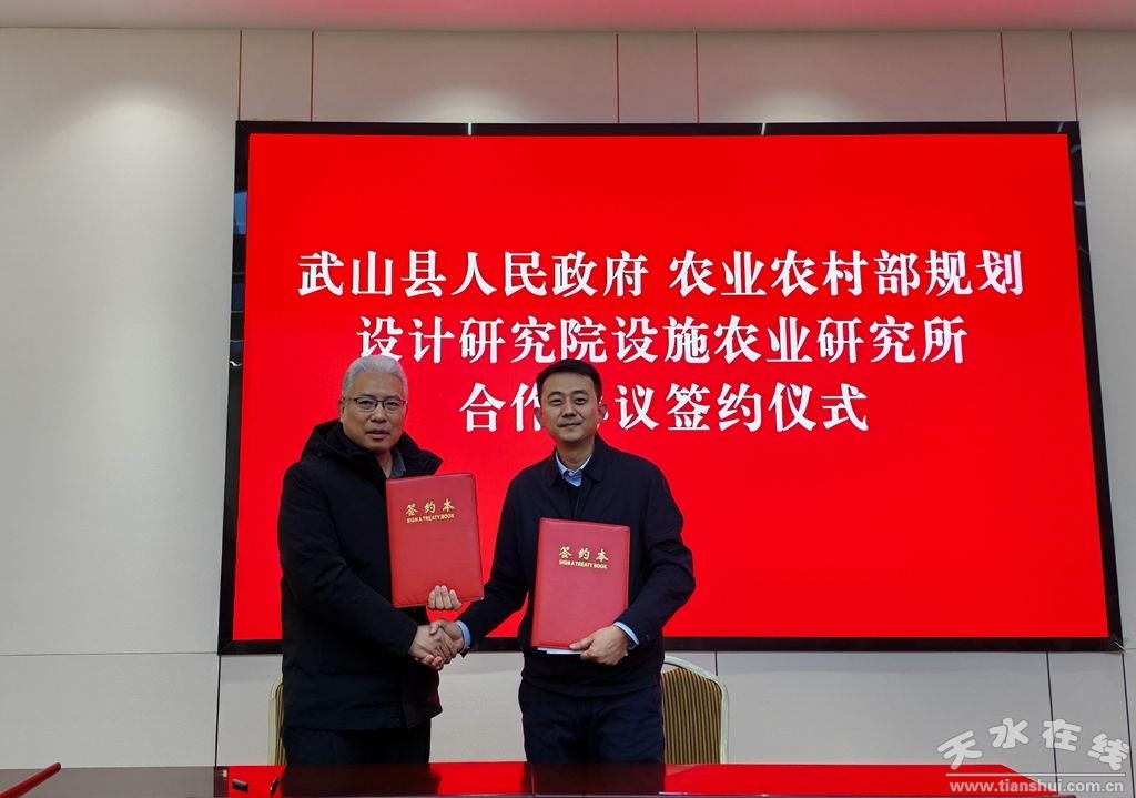 新武山訊(記者 車彤瑤)2月24日上午,武山縣人民政府與農(nóng)業(yè)農(nóng)村部規(guī)劃設(shè)計(jì)研究院設(shè)施農(nóng)業(yè)研究所正式簽署合作協(xié)議,雙方以產(chǎn)業(yè)發(fā)展和科技成果轉(zhuǎn)化為載體,共同打造“甘肅樣板、西部一流、全國標(biāo)桿”的全國現(xiàn)代設(shè)施農(nóng)業(yè)創(chuàng)新引領(lǐng)區(qū)。農(nóng)業(yè)農(nóng)村部規(guī)劃設(shè)計(jì)研究院設(shè)施農(nóng)業(yè)研究所所長(zhǎng)丁小明、副所長(zhǎng)徐鑫,縣政府副縣長(zhǎng)王巖,縣直相關(guān)部門單位和鄉(xiāng)鎮(zhèn)負(fù)責(zé)人參加簽約儀式。