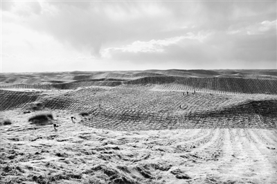 這里是千里沙漠大林帶的項目區(qū)。人們在一座座沙丘上仔細地開溝、鋪草、壓沙,做好一個又一個1.5米長、1.5米寬的草方格。臉膛曬得黑紅的壓沙隊施工隊長胡開軍說,“梭梭要在4月底前栽完,保證85%的成活率。”