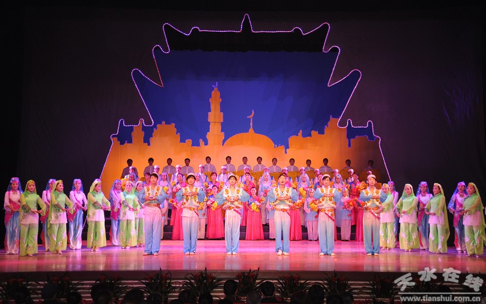 通過花兒,也通過這部大型音樂舞蹈史詩劇,唱出了張家川“舉特色旗,打民族牌,走民營路,建和諧縣”的基本方略,更唱出了“發(fā)展高于一切,穩(wěn)定壓倒一切,民生重于一切,黨建保證一切”的基本理念,當然了也唱響了“搶抓機遇、奮力趕超,強力推動張家川經(jīng)濟社會跨越式發(fā)展”的主題。