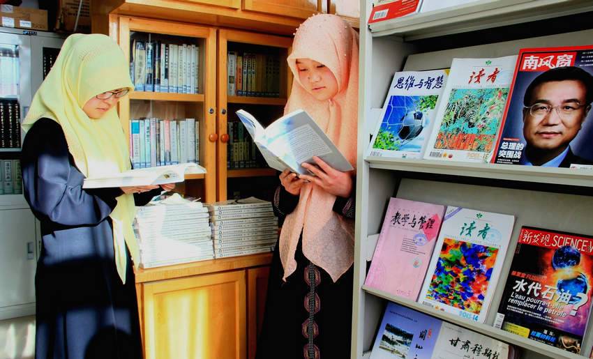 4月22日,張家川縣阿語學(xué)校圖書室,回族姑娘馬淑芳、蘇珊景秀分別在閱讀《實用阿拉伯語》和一位巴勒斯坦外交官撰寫的《在中國的日子》(阿拉伯文版)。超過5000本的藏書占據(jù)了圖書館內(nèi)大量空間,沒有專門的閱覽室,許多時候,馬淑芬和同學(xué)們只好在圖書館里站著看書。比起在圖書館站著看書,馬淑芳她們更喜歡把書借出去,到宿舍或者教室閱讀。