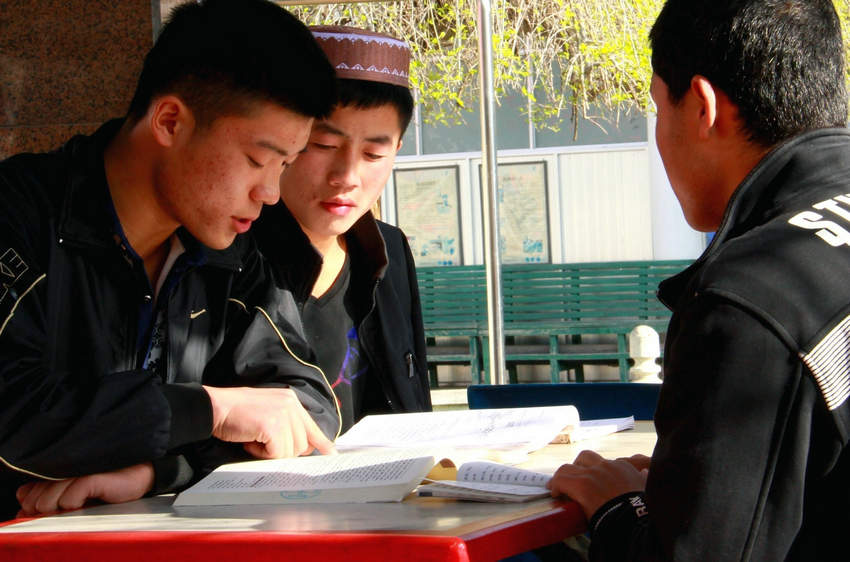 4月22日,縣阿語學(xué)校校園里,三年級學(xué)生李炎正在給一年級秋季班的冶存仁和馬軍軍講解一本阿拉伯語版的課外讀本。