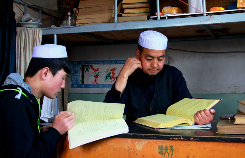 4月22日,西關(guān)清真寺里,副教長、阿訇張富山對照著一本經(jīng)堂語讀本聽學(xué)生閔麻朗誦其中的內(nèi)容。