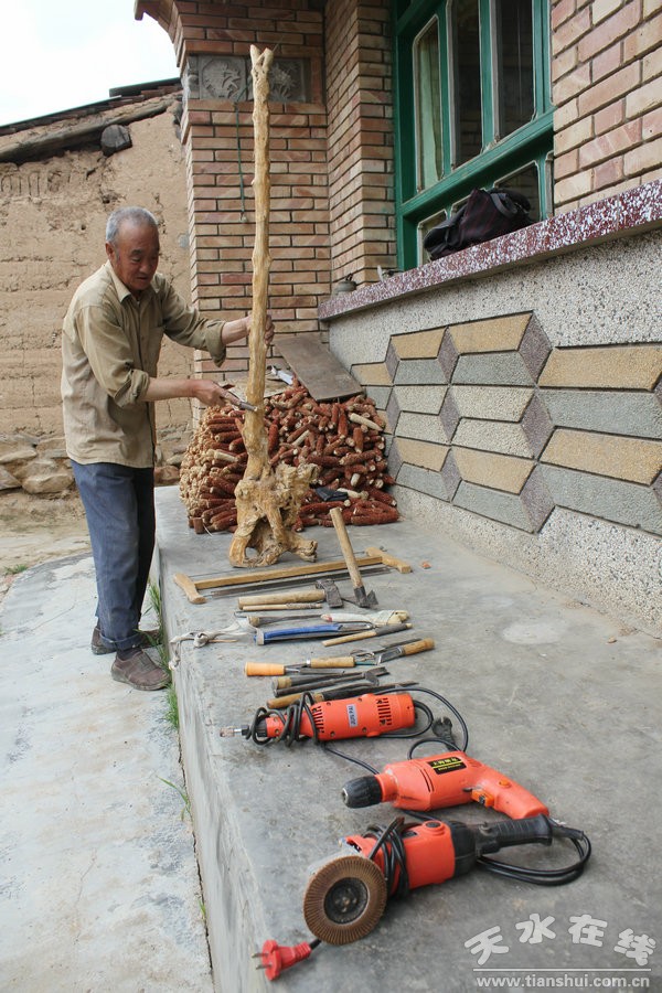 他一有時間,就去關(guān)山深處搜集、挑選有原始形狀的樹根,試著進(jìn)行創(chuàng)作,經(jīng)過反復(fù)琢磨、構(gòu)思,再進(jìn)行創(chuàng)作”,當(dāng)?shù)谝患褡髌烦尚魏,得到了家人的一致好評。楊翰林從此便一發(fā)不可收拾,經(jīng)常利用閑暇時光到山上、溝里、坡地、懸崖、建筑工地、垃圾堆等處尋覓作品源。