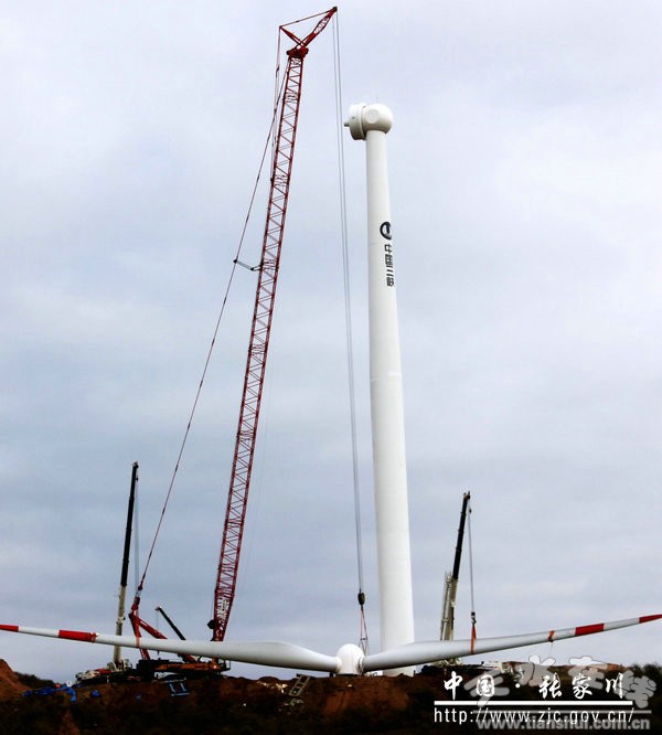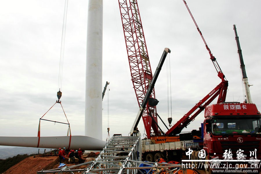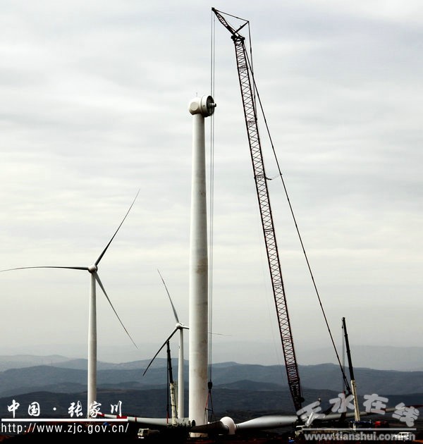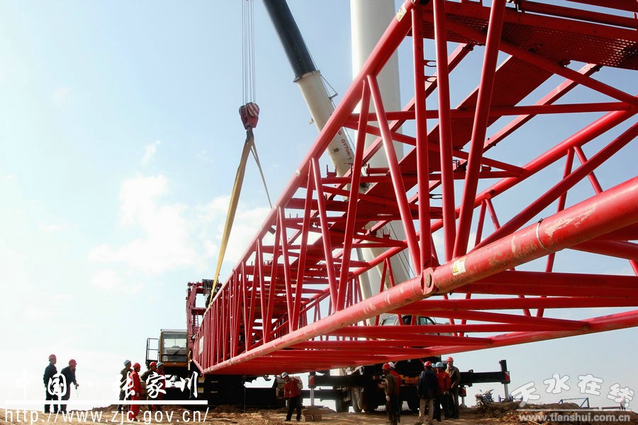 “風(fēng)機(jī)吊裝工作準(zhǔn)備就緒,開始起吊!”10月30日下午,在位于張家川回族自治縣張棉驛鄉(xiāng)、平安鄉(xiāng)境內(nèi)的天源一期49.5兆瓦風(fēng)力發(fā)電項(xiàng)目施工場地,隨著總指揮一聲令下,天源一期49.5兆瓦風(fēng)力發(fā)電第三臺(tái)風(fēng)機(jī)整機(jī)吊裝工作啟動(dòng)。在寒風(fēng)凜冽中,40多名工作人員經(jīng)過近3小時(shí)的通力協(xié)作,按照既定預(yù)案配合千噸主吊將塔筒、機(jī)艙、葉片成功安裝到位。風(fēng)機(jī)吊裝完成后,現(xiàn)場一片歡呼!暗谌_(tái)風(fēng)機(jī)吊裝又成功了。”張家川天源一期49.5兆瓦風(fēng)力發(fā)電項(xiàng)目基地工程部經(jīng)理高興地告訴記者。