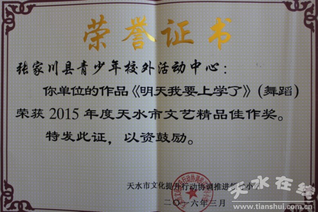 3月2日,在天水市召開的宣傳思想工作會議上,重點表彰了一批具有代表性的2015年度文藝精品佳作,經(jīng)過認真篩選,最終評出集體優(yōu)秀作品獎6項、個人優(yōu)秀作品獎9項,分別給予獎勵并頒發(fā)榮譽證書。其中,由張家川縣青少年校外活動中心編導(dǎo)的少兒舞蹈《明天我要上學(xué)了》、李繼宗創(chuàng)作的詩歌《在涇川,河水痛苦而焦急地流著》分別被天水市文化提升行動協(xié)調(diào)領(lǐng)導(dǎo)小組評為2015年度天水市文藝精品佳作集體獎和個人獎。