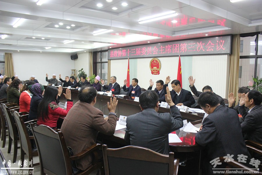 10月23日下午,中國人民政治協(xié)商會(huì)議張家川回族自治縣第十三屆委員會(huì)第一次會(huì)議召開主席團(tuán)第三次會(huì)議。會(huì)議應(yīng)到主席團(tuán)成員30名,實(shí)到26名,符合《政協(xié)章程》規(guī)定。關(guān)春生主持會(huì)議。