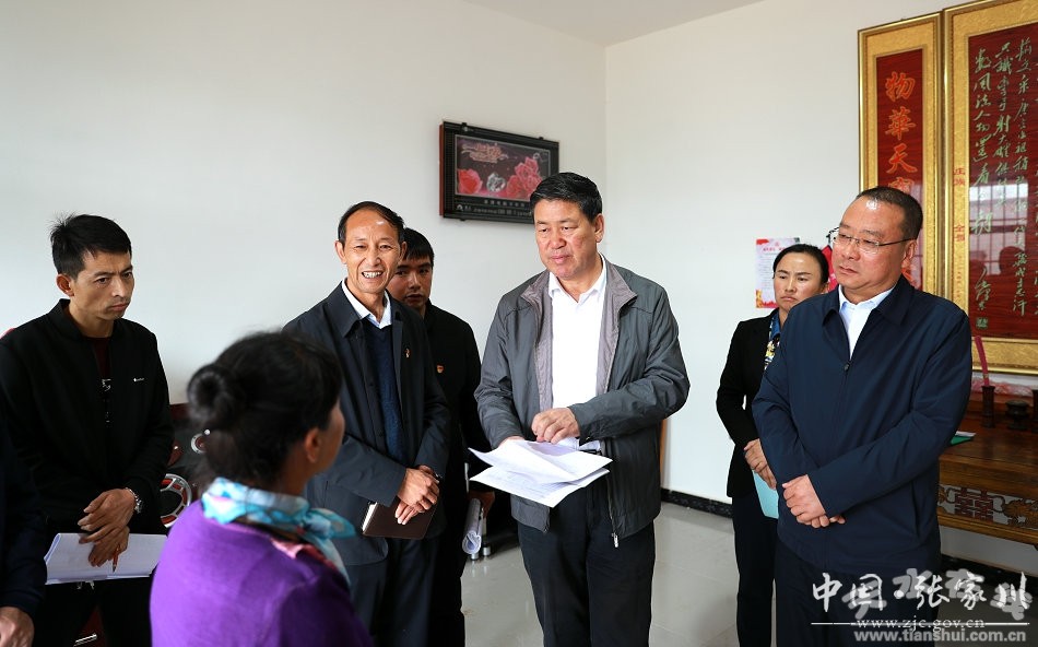 在兩村實地查看過程中,王軍隨機抽查走訪了6戶貧困戶,與他們一一親切交談,詳細了解他們的生產(chǎn)生活、扶貧政策宣傳落實、幫扶責(zé)任人到崗和幫扶作用發(fā)揮情況,鼓勵他們增強脫貧致富的信心,堅決克服“等、靠、要”的思想,努力通過勤勞的雙手過上幸福的生活。在水泉村貧困戶柴小紅家,當(dāng)王軍聽說柴小紅弟弟柴宏錄是張家川縣2016年理科狀元,現(xiàn)就讀于西安電子科技大學(xué),妹妹柴蕭燕在張家川縣第一中學(xué)上學(xué),系因?qū)W致貧的情況后。王軍對柴小紅的母親深情地說:“讀書能改變命運。你的幾個孩子學(xué)習(xí)優(yōu)秀,成績突出,是對你們?nèi)易畲蟮陌参,再苦再累也要堅持供給孩子讀書,完成學(xué)業(yè),千萬不可半途而廢,孩子將來一定可以大有作為!”