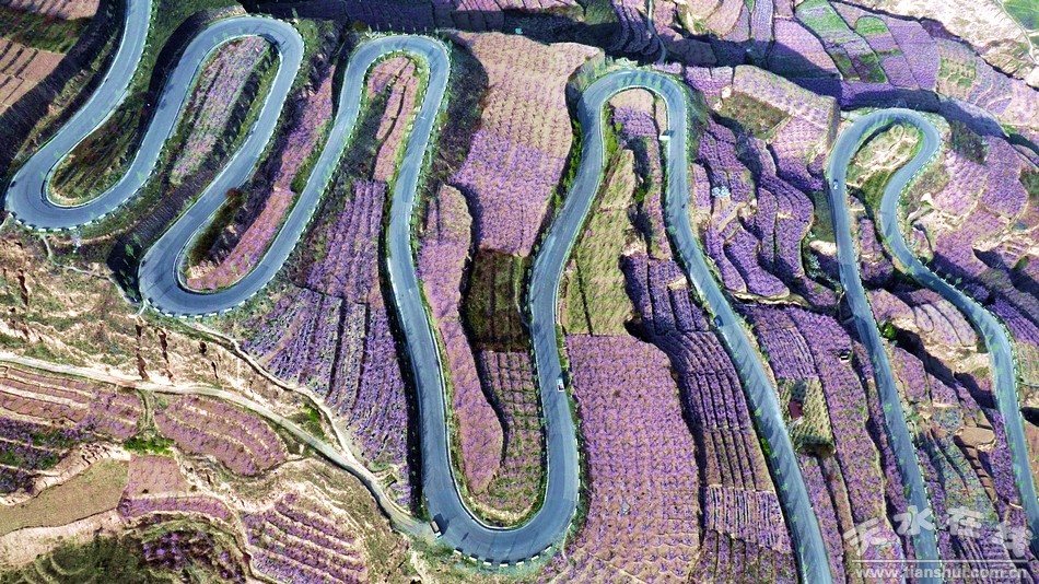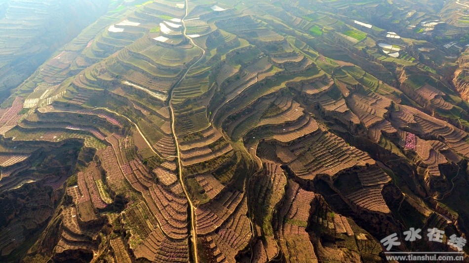 一座座蜿蜒起伏的青山,有情有義,敞開寬廣的胸懷,迎接春天的和風細雨。一塊塊錯落有致的梯田,有說有笑,露出明媚的笑臉,歌唱春天的花紅草綠。有人將梯田媲美長城,說它們都是人類創(chuàng)造的奇跡,可不同在于,長城像是遒勁有力的狂草,一筆覆蓋山川河流,走筆龍蛇;梯田則像是工工整整的小楷,一絲不茍地就著山形變幻著形狀,成為大地之上最美的曲線。如詩如畫的梯田景觀裝飾了秦安的春天,猶如一幅不停舒展著的畫卷,那蜿蜒的曲線便是大自然的杰作。這是一片神奇的土地,那鬼斧神工雕鑿而成的層層梯田,云霧繚繞的山野村莊,自然淳樸的民間風情,隨處可定格為一幅絢麗迷人的風情畫。在春日陽光的沐浴下,梯田依偎著村舍,村舍里燃起炊煙,炊煙追逐著風,風舞動花海,花海上灑滿了陽光,一切是那樣的契合,那樣的攝人心魄。你看那遠處的梯田,如鏈似帶,層疊起伏,高低錯落,好像一層層姹紫嫣紅的海浪,從遙遠的天邊滾滾落下。放眼望去,花田環(huán)抱著大山,一切都分布的井井有條,哪里走路哪里栽樹、哪里分割哪里合攏,都經(jīng)過了精心的設(shè)計,讓人不得不感嘆勞動人民的智慧。歷經(jīng)千年開墾躬耕,始得如今樣貌,秦安的梯田是藏在深山里的閨秀,千百年來,靜靜地躺在大山的懷抱里,而今終于因天水在線的一次航拍,以最質(zhì)樸的容顏,展露在世人面前。