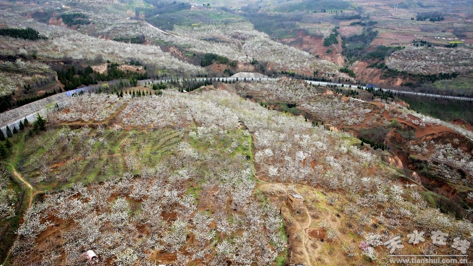 微風(fēng)吹來(lái),天水的春天里散發(fā)著淡淡地清香,即便是久居在市區(qū)的人們也能聞到。那是從天水城北3公里處的羅峪溝里飄來(lái)的,是從一個(gè)名叫煙鋪村的萬(wàn)畝大櫻桃園里散發(fā)出來(lái)的。三月的煙鋪大櫻桃花開(kāi)成海,像極了身披白紗的新娘,美麗、溫情而又光彩照人。