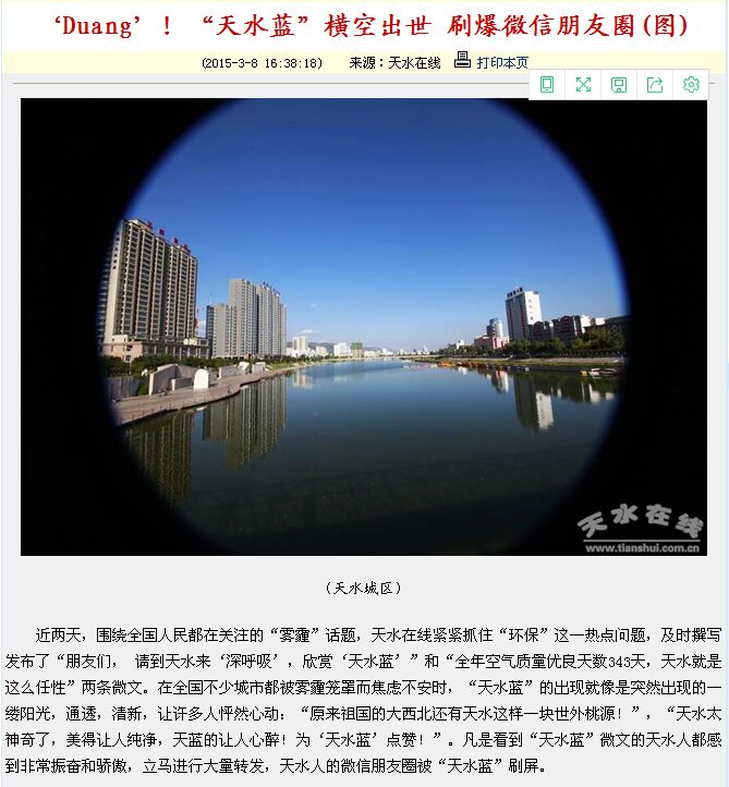 ▲2015年5月26日,在2015(乙未)年公祭中華人文始祖伏羲大典暨第二十六屆中國(guó)天水伏羲文化旅游節(jié)召開(kāi)前夕,天水市人民政府櫥窗推出“天水藍(lán)”專題。該專題重點(diǎn)報(bào)道天水市開(kāi)展環(huán)境保護(hù)專項(xiàng)行動(dòng)成果,展示天水良好的生態(tài)環(huán)境。