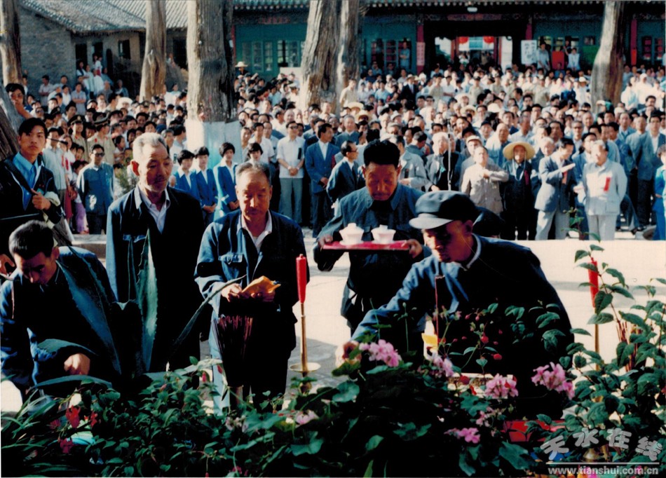 1988年,天水市首次舉行伏羲祭典活動。那年我26歲,在天水市勞動人事局辦公室從事文秘工作。我作為一名年輕的大學畢業(yè)生,剛踏入社會,能在如此重要的部門和崗位工作,深感榮幸。當時,按照市勞動人事局喬正風局長和局里的安排,由我與市政府辦公室和市文化局、市建委等部門具體聯(lián)系,辦理相關事務,及時反饋信息。我有幸參與了這次祭典活動。由于我參與的有關活動不多,更沒有干啥要緊事,加之時光已過去三十年,所以,這次祭典活動給我留下的印象是零碎的,但難以忘懷。在此,我憑自己模糊的記憶,并借助于有關資料,做些簡要追憶。