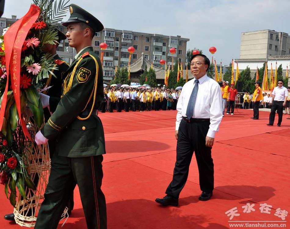 十屆全國(guó)人大常委會(huì)副委員長(zhǎng)、原民革中央主席何魯麗,國(guó)家有關(guān)部委代表,甘肅省委書記、省人大常委會(huì)主任陸浩,省政協(xié)主席陳學(xué)亨,老同志李子奇及省直部門領(lǐng)導(dǎo),“關(guān)中—天水經(jīng)濟(jì)區(qū)”六市一區(qū)有關(guān)領(lǐng)導(dǎo),世界各地著名華人社團(tuán)組織和各界代表向伏羲圣像敬獻(xiàn)了花籃。近1萬人參加了祭祀儀式。