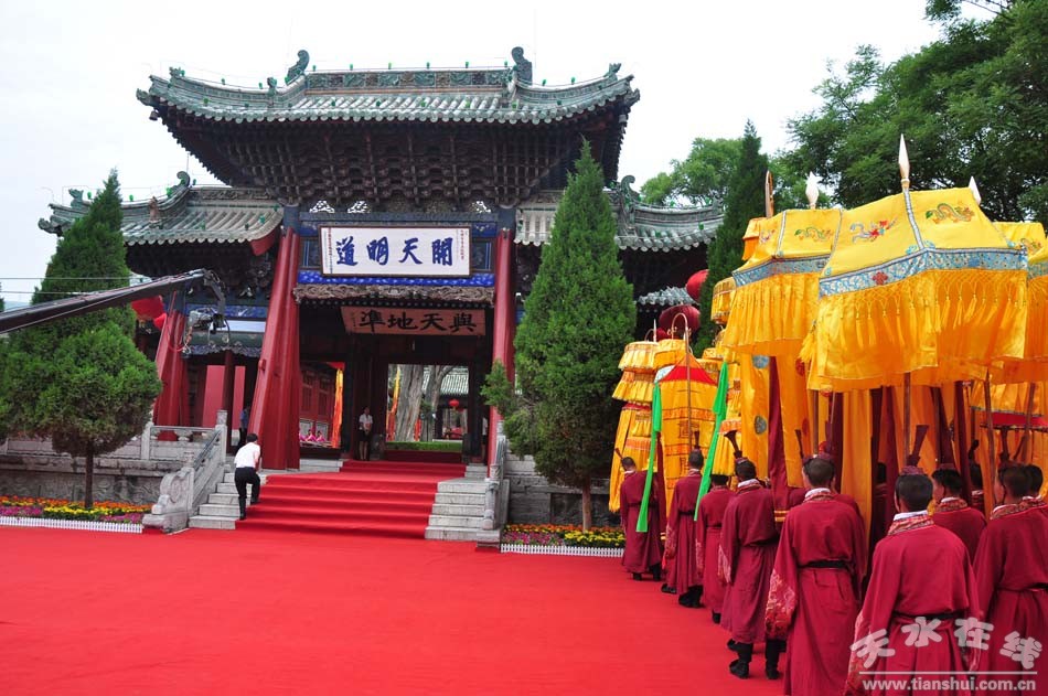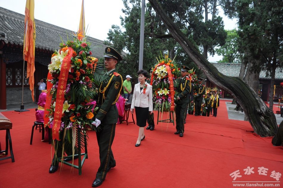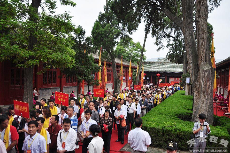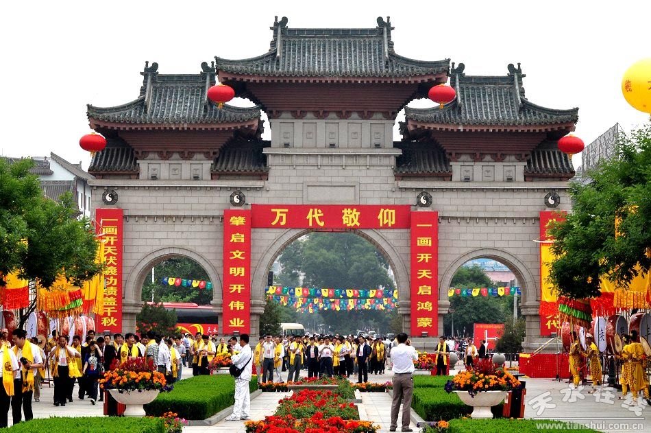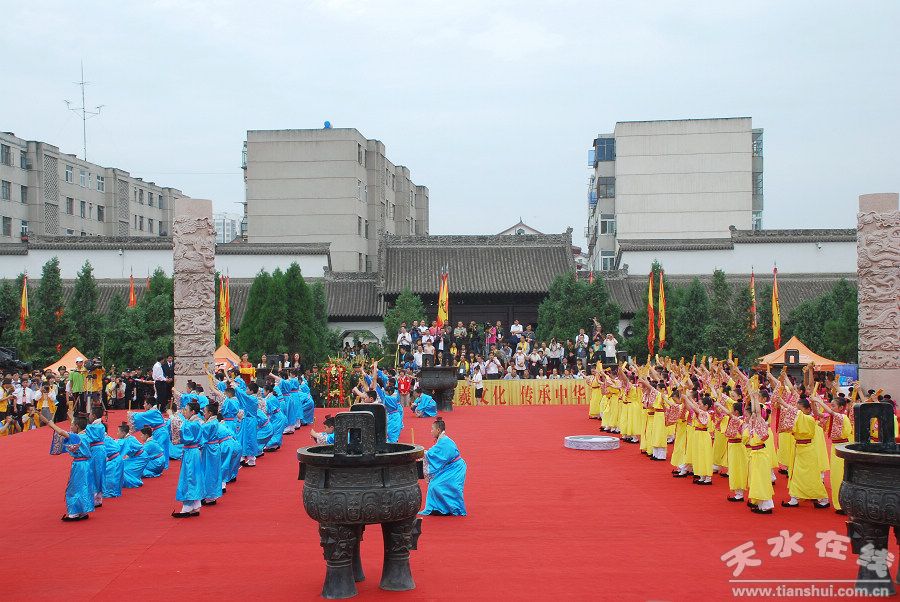 2011年6月22日上午,天水市伏羲祭祀廣場古樂悠悠,氣勢恢宏;伏羲廟內(nèi)古柏掩映,莊嚴肅穆。由甘肅省人民政府主辦,天水市人民政府、甘肅省文化廳承辦的2011(辛卯)年甘肅省公祭中華人文始祖太昊伏羲大典在這里隆重舉行。海內(nèi)外中華兒女近萬人匯聚一起,傳承中華文明,公祭人文始祖,表達對太昊伏羲的虔誠和敬仰。