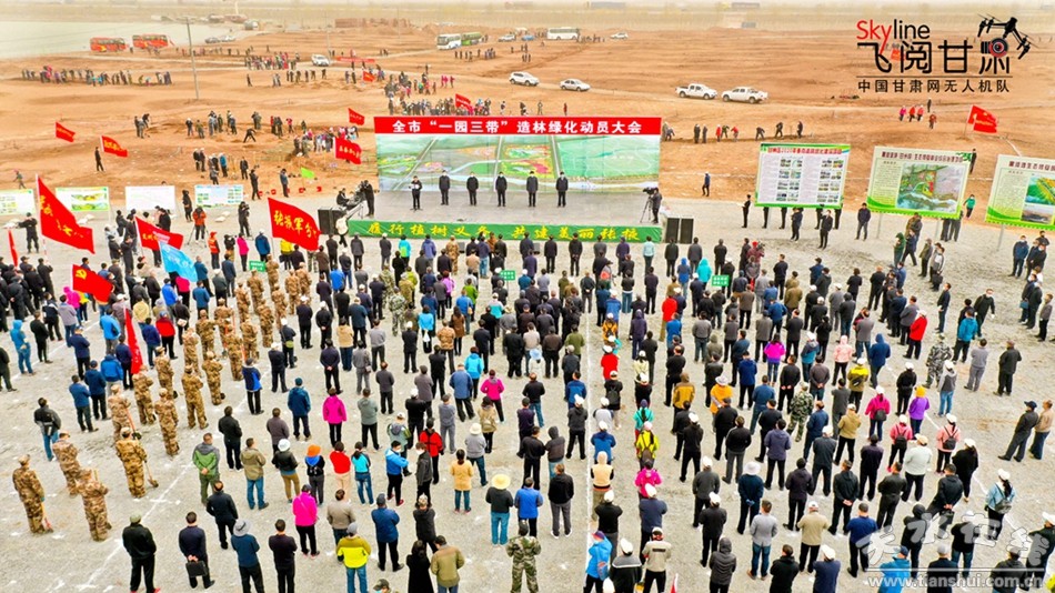 4月10日,甘肅張掖干部職工和社會(huì)各界群眾在甘州區(qū)黑河生態(tài)新城生態(tài)修復(fù)胡楊林營(yíng)造基地植樹現(xiàn)場(chǎng)召開造林綠化動(dòng)員大會(huì)。(無人機(jī)航拍)