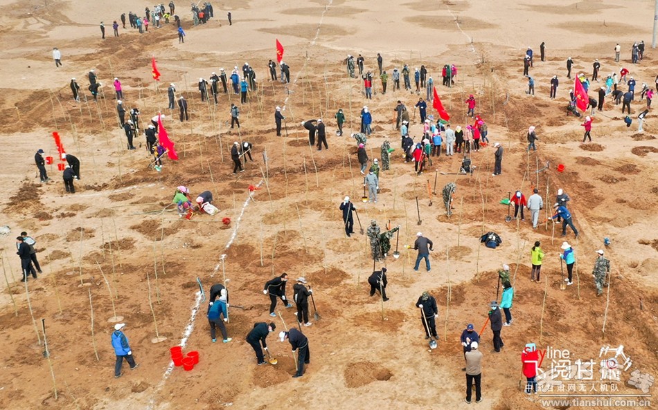 4月10日,甘肅張掖干部職工和社會(huì)各界群眾來到甘州區(qū)黑河生態(tài)新城生態(tài)修復(fù)胡楊林營(yíng)造基地植樹現(xiàn)場(chǎng),揮鍬鏟土、挖坑、栽苗。(無人機(jī)航拍)