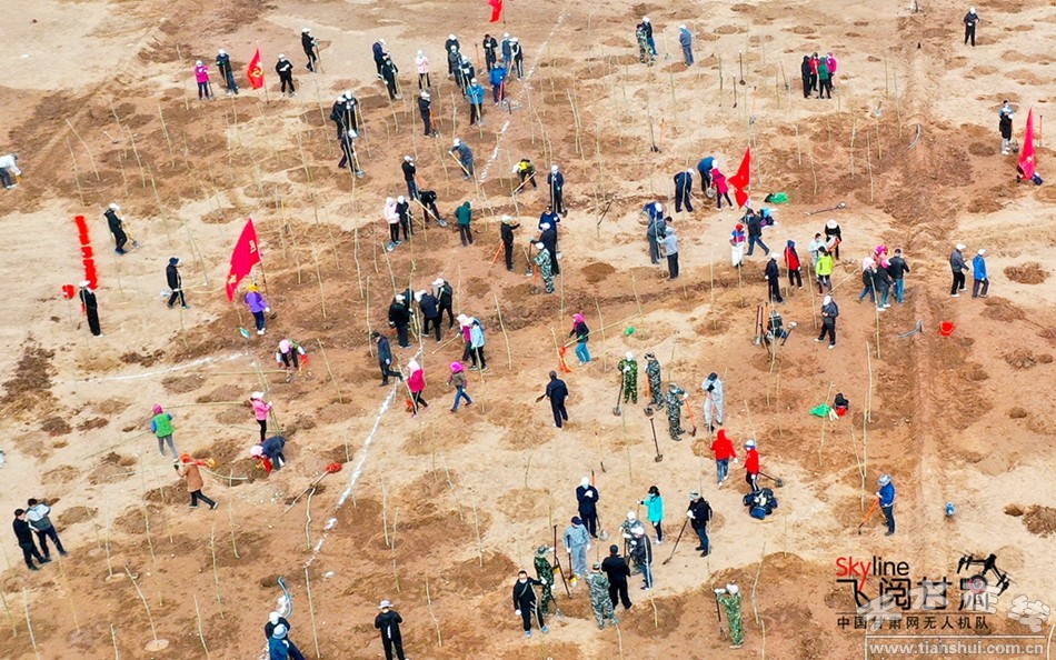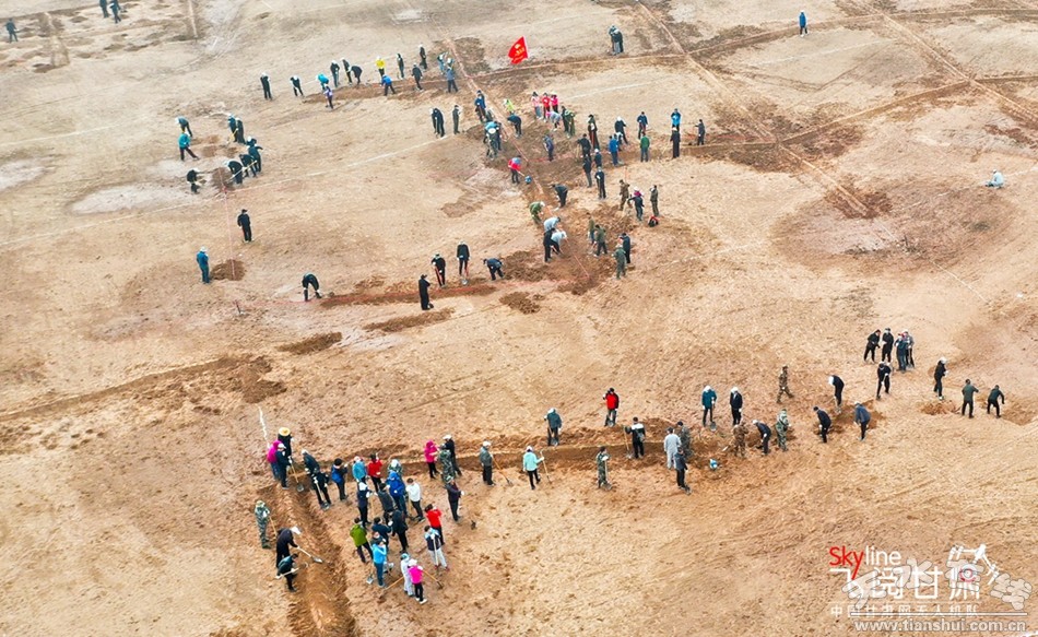 4月10日,甘肅張掖干部職工和社會(huì)各界群眾來到甘州區(qū)黑河生態(tài)新城生態(tài)修復(fù)胡楊林營(yíng)造基地植樹現(xiàn)場(chǎng)平整植樹土地。(無人機(jī)航拍)