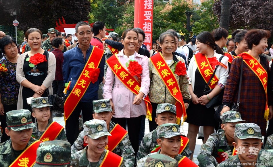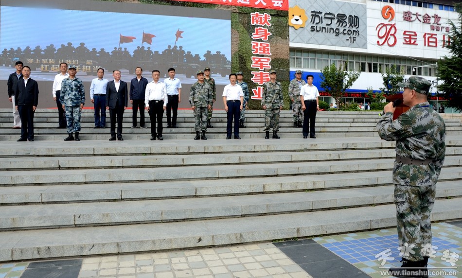 市委書記王銳,市人大常委會(huì)主任、市委秘書長(zhǎng)蔣曉強(qiáng),市委常委、副市長(zhǎng)王洪義,天水軍分區(qū)司令員劉甫清,市人大常委會(huì)副主任宋建平、市政協(xié)副主席郭明興出席歡送大會(huì)并為入伍新兵代表及家庭頒發(fā)《光榮入伍通知書》和光榮軍屬牌。天水軍分區(qū)政委袁敬偉主持歡送大會(huì)。
