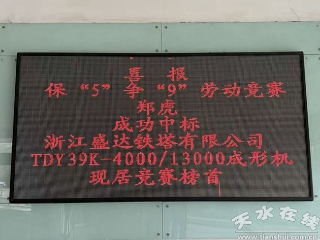 12月19日,從天水鍛壓機床(集團)有限公司經(jīng)銷處傳來振奮人心的捷報。在集團公司正火熱開展的“!5’爭‘9’”銷售攻堅勞動競賽中,銷售戰(zhàn)線傳來重大突破——銷售員鄭虎憑借其出色的專業(yè)能力與頑強的拼搏精神,在激烈的市場競爭中成功中標浙江盛達鐵塔有限公司近1000多萬元TDY39K-4000/13000成形機項目,以這一標志性戰(zhàn)績一舉躍居本次勞動競賽個人榜榜首。