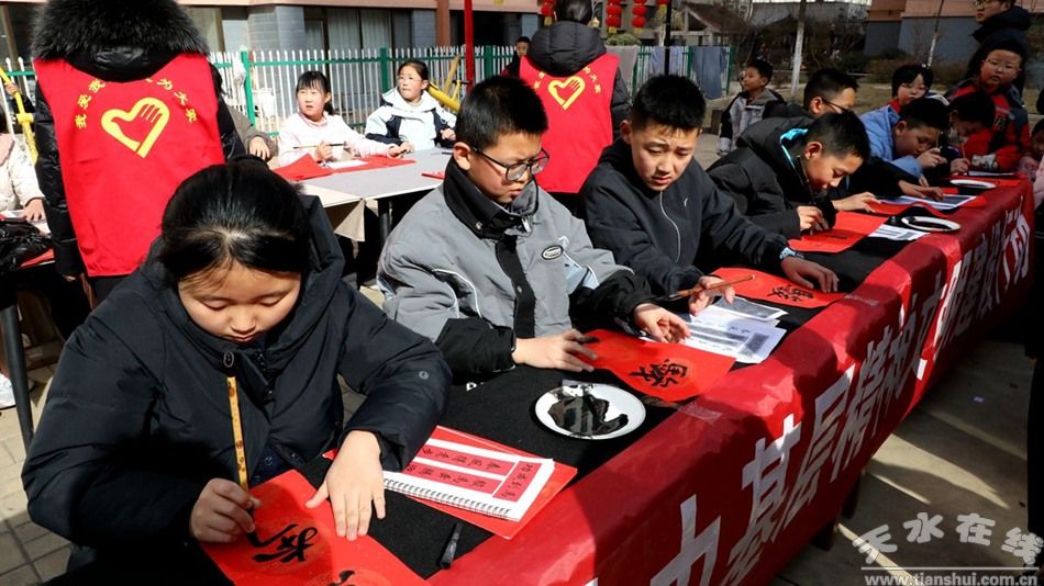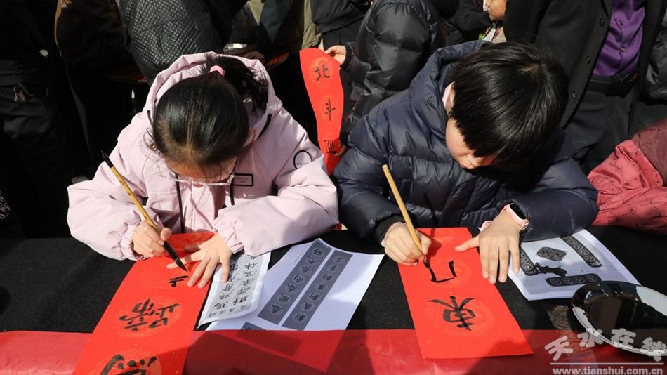 活動(dòng)現(xiàn)場(chǎng),大紅宣紙整齊鋪展,筆墨硯臺(tái)依次排開(kāi),濃濃的墨香與陣陣歡笑交織成新春序曲。在老師的悉心指導(dǎo)下,一木書(shū)社的小朋友們身著整潔服裝,坐姿端正、神情專(zhuān)注,提筆、運(yùn)筆、收鋒一氣呵成?瑫(shū)端莊規(guī)整,行書(shū)流暢靈動(dòng),“金馬奔騰開(kāi)勝景,春風(fēng)浩蕩展宏圖”“福滿家園添喜氣,春回大地兆豐年”等寓意吉祥的聯(lián)語(yǔ)躍然紙上,一個(gè)個(gè)飽滿厚重的“!弊殖休d著對(duì)新年的美好期許。居民或駐足觀賞孩子們的創(chuàng)作過(guò)程,或挑選心儀的春聯(lián),不時(shí)為小書(shū)法家們的精湛技藝點(diǎn)贊,現(xiàn)場(chǎng)一派熱鬧溫馨的景象。