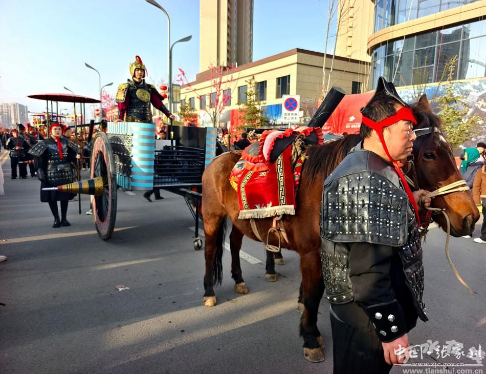 作為今年社火的“重頭戲”,馬元素貫穿始終。激昂的鑼鼓聲伴隨著清脆的馬蹄聲,一輛輛仿古戰(zhàn)國馬車疾馳而過,車上的“武士”身著鎧甲,手持戈戟,瞬間將觀眾的思緒拉回到那風(fēng)云激蕩的秦人先祖牧馬拓疆的歲月,歷史的厚重感撲面而來,這支馬車隊伍也是文物活化利用的生動實踐。在陣陣激昂的鼓點中,“馬社火”驚艷亮相。表演者們裝扮成三國名將,威風(fēng)凜凜地騎在高頭大馬上,盡顯西北人的豪邁。